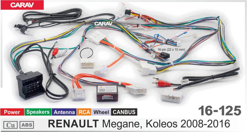—CARAV 16-125 16-pin комплект подключения базовых магнитол для Renault Megane 2008-2016 / Power + Speakers + Antenna + Wheel + RCA + CANBUS
